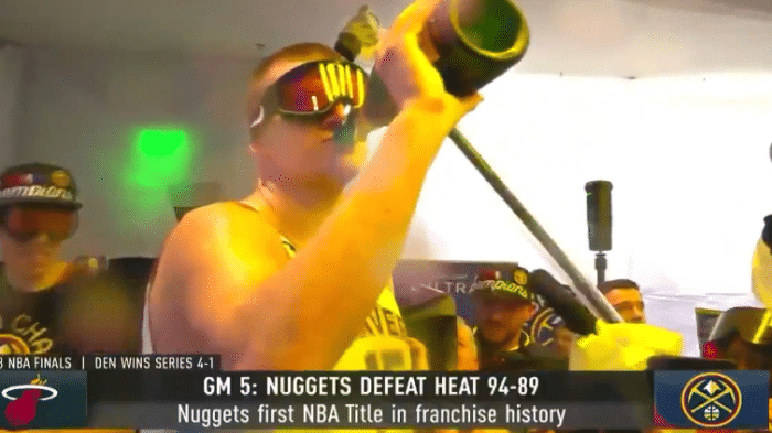 掘金更衣室狂欢曝光:夺冠后全队狂喷香槟庆祝 约基奇直接对瓶吹