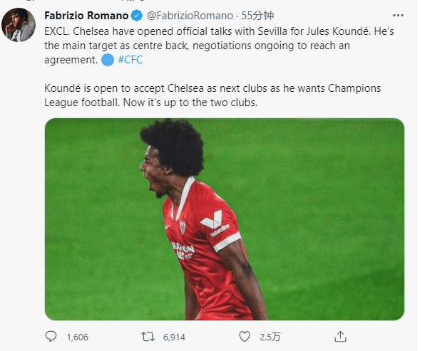 360直播讯讯 记者罗马诺消息,切尔西已经就法国后卫孔德的转会和塞维利亚开启了官方谈判。