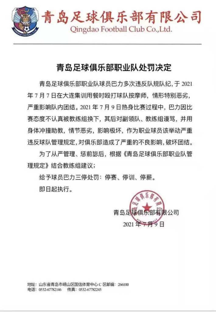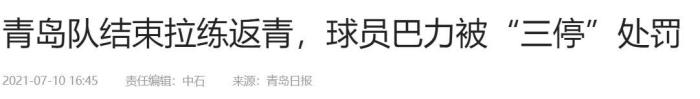 《青岛日报》表示,昨天,在大连进行拉练的青岛队与上海申花进行了第二场热身赛,拉多尼奇打进一球,最终1:3小负对手。但就在这场比赛期间,由于不满教练换人,下场后的巴力做出了极不冷静的行为,造成了极坏的影响。在此情况下,俱乐部决定对巴力实行停赛、停训、停薪的“三停”处罚。